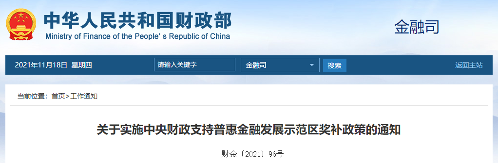 为贯彻落实党中央、国务院关于发展普惠金融和支持小微企业、“三农”融资发展的决策部署,在总结财政支持深化民营和小微企业金融服务综合改革试点城市工作经验的基础上,财政部、人民银行、银保监会自2022年起组织实施中央财政支持普惠金融发展示范区奖补政策。现就有关事项通知如下: