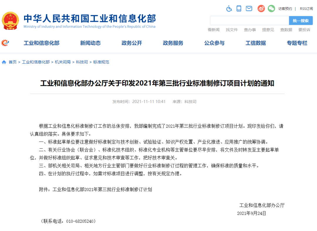 2021年11月11日,工业和信息化部办公厅发布《2021年第三批行业标准制修订项目计划》的通知,由工业和信息化部信息技术发展司推动制定的9项工业设备上云行业标准,以及工业互联网平台术语、模型分类等2项基础性行业标准正式批准立项。