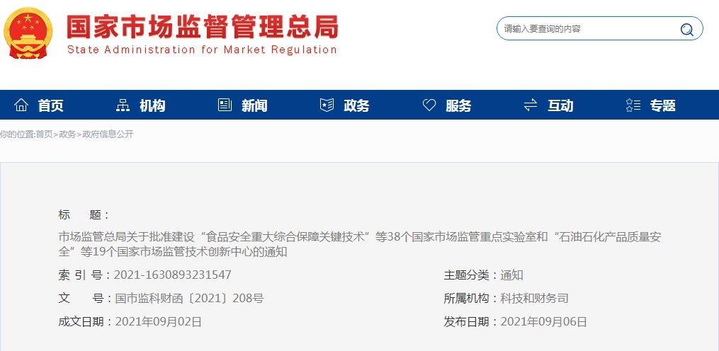 近日,国家市场监督管理总局发文,批准建设“食品安全重大综合保障关键技术”等38个国家市场监管重点实验室和“石油石化产品质量安全” 等19个国家市场监管技术创新中心(见附件)。具体内容如下: