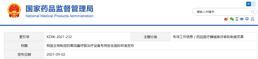 2021年8月30日,国际标准《医用电气设备 第2-90部分:高流量呼吸治疗设备的基本安全和基本性能专用要求》,由国际标准化组织(International Organization for Standardization,ISO)和国际电工委员会(International Electrotechnical Commission,IEC)官网发布(标准号:ISO 80601-2-90:2021),这是由我国提出并负责完成的首个新冠肺炎疫情防控医疗器械国际标准项目。