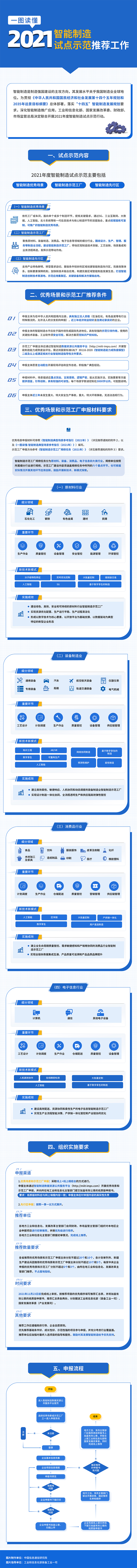 近日,工业和信息化部办公厅、国家发展改革委办公厅、财政部办公厅、市场监督管理总局办公厅发布了关于开展2021年度智能制造试点示范行动的通知,中国信息通信研究院绘制了2021智能制造试点示范推荐工作图解,具体如下: